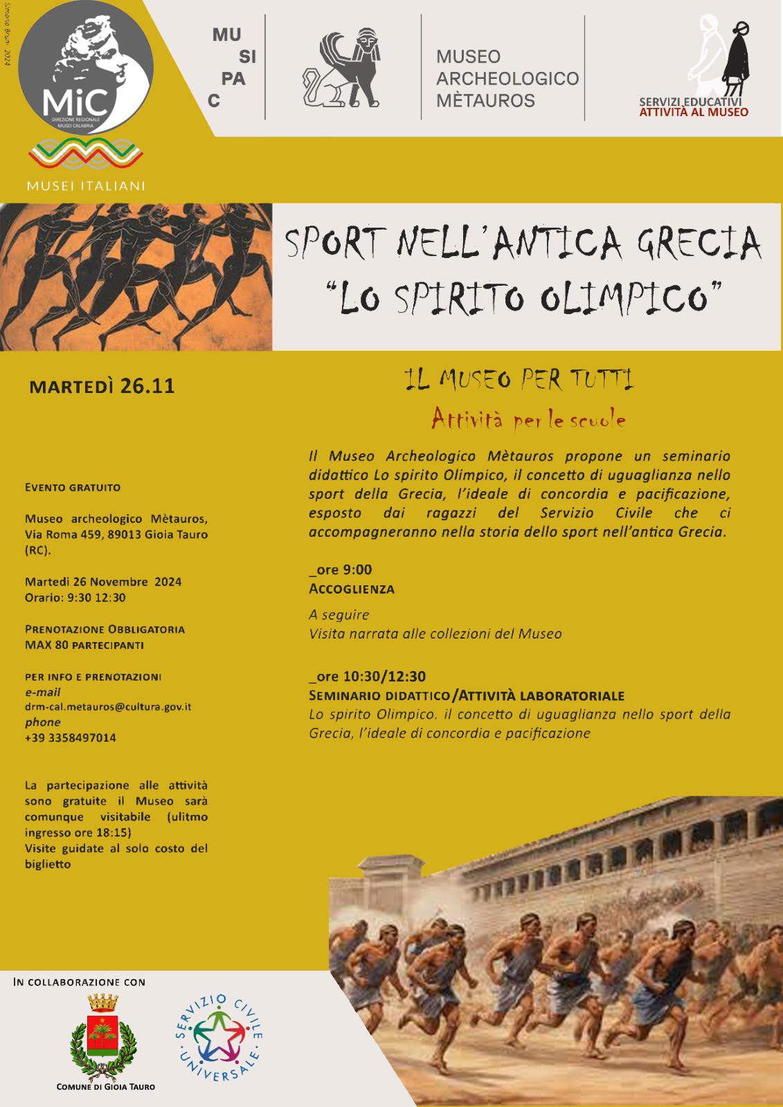 Il Museo Archeologico Mètauros propone un Seminario didattico e attività laboratoriale dal titolo “Lo spirito olimpico” martedì 26 novembre. Una mattinata dedicata alle scuole, che partirà con una visita narrata alla collezione museale, per approfondire i pezzi della collezione che rimandano all’ideale dello spirito olimpico e alla storia delle discipline sportive nell’antica Grecia.