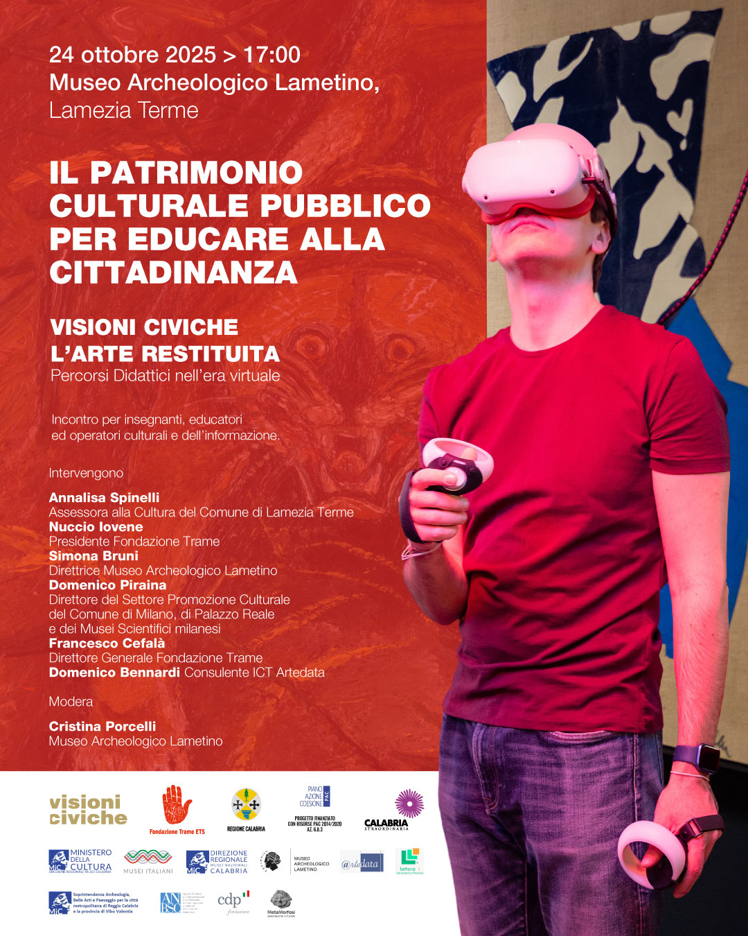 Destinato in particolar modo ai dirigenti scolastici, insegnanti, educatori ed operatori culturali e dell’informazione, l’appuntamento di venerdì 24 ottobre, alle ore 17, è occasione per presentare il progetto Visioni Civiche: L’Arte Restituita. Percorsi Didattici nell’era virtuale a cura di Fondazione Trame e per presentare il Progetto Educativo per le Scuole 2025-26 del Museo Archeologico Lametino.